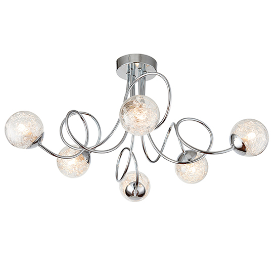 A modern style ceiling light with flowing loop arms, finished in chrome, each clear glass shade is filled with thin wire and threaded with glass beads to create a striking light pattern. FEATURES : Material : Steel, Glass, Wire Finish : Chrome, Clear 6 x 3W LED G9 (bulb not included) Chrome plate with clear glass & chrome wire Constructed from steel & glass & aluminium Dimmable Available at an affordable price Images shown are for illustration purpose only DIMENSIONS : Projection : 300mm Diameter : 710mm