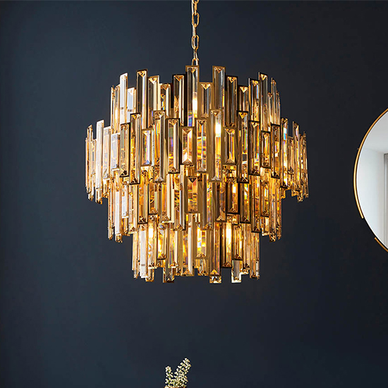 FEATURES : Eureka 15 Lights Crystal Glass Ceiling Pendant Light In Gold 15 x 6W LED E14 (bulb not included) Impressive large scale chandelier Gold effect plated metalwork High quality champagne tinted crystals Create striking light pattern Height adjustable chain with 1. 5 metre clear cable Dimmable Perfect for use with E14 LED lamps Available at an affordable price Images shown are for illustration purpose only DIMENSIONS : Height : 800mm to 2100mm Diameter : 720mm