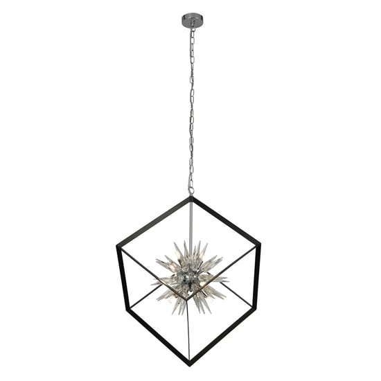 This eye-catching ceiling pendant comprises of a large matt black metal square frame encasing a cosmic display of stunning solid crystal icicles would add a bold statement feature to any home. FEATURES : Material : Mild Steel and Glass Finish : Black The Stellar pendant light also boasts a dimmer function and adjustable hanging chain so you can create the perfect look for your home Lamp Holder Type : G9 Wattage : 33 Dimmable : Yes, with external dimmer and dimmable LED bulbs Lamp Included : No Available at an affordable price Images shown are for illustration purpose only DIMENSIONS : Total Height : 1530mm Height : 740mm Width : 650mm